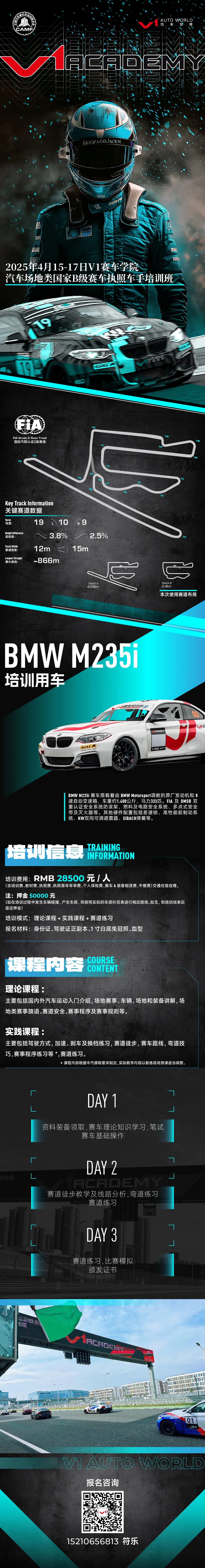 时间进入2025年,也代表新的赛季开始了,F1世界锦标赛已经完成新赛季的试车,3月底即将在上海开战,这是全球赛车车迷最为瞩目的国际盛会。WEC 世界耐力锦标赛更是快人一步,已经在卡塔尔完成揭幕战。TCR Asia也定于4月份在上海开跑。琳琅满目的比赛固然好看,但是有没有那么一刻你幻想过自己也能参与其中,成为赛车场上风驰电掣的一员呢? 这一步其实并不遥远,参加V1赛车学院举办的汽车场地类国家B级赛车执照车手培训班,考取赛照即可成为一名真正的赛车手!这里有顶尖的教官团队,全套的车手安全装备,专业的保障团队,优秀的赛道条件。为您打造专属赛道特训,想要成为车手,总要有第一次的华丽开始!